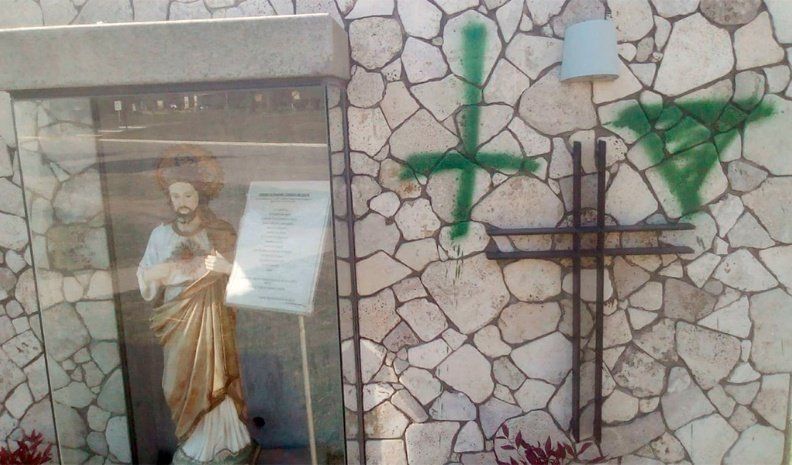 Diego Rebuffo, párroco de Ucacha, confirmó que las pintadas fueron producidas entre la noche del sábado y la madrugada del domingo. El sacerdote trasladó su preocupación en la misa de esta mañana.