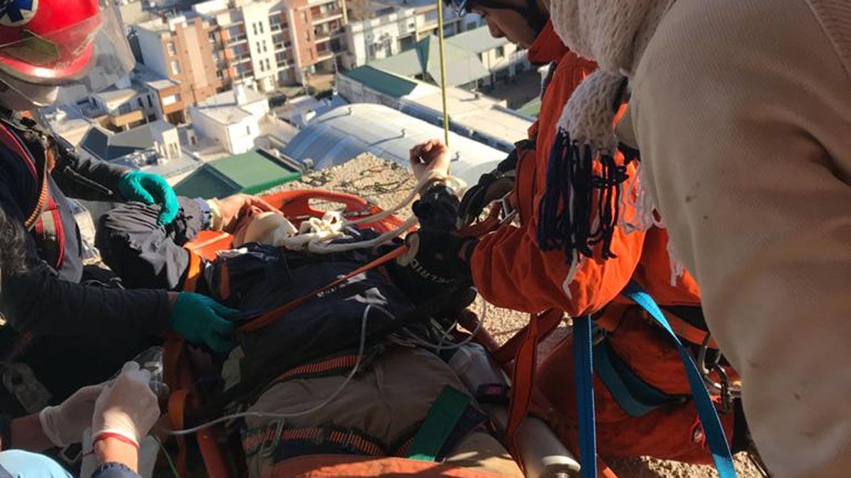 Precisamente efectivos del grupo DUAR, que pertenece a Bomberos de la Policía de Córdoba, completaron el rescate vertical a través de una camilla cesta desde el exterior de la torre.