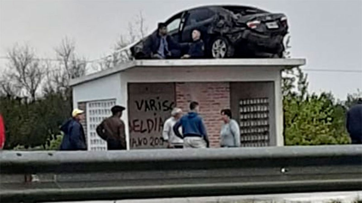 Un automóvil quedó apostado sobre el techo de una garita de colectivos luego de despistar y chocar un guardarraíl, en un accidente que dejó al conductor con heridas a considerar.