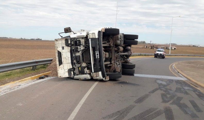 Un camión cargado con maní volcó en la rotonda de acceso sur a la localidad de General Cabrera, ocasionando complicaciones en el tránsito por el sector, mientras que el conductor resultó ileso, informó la Policía.