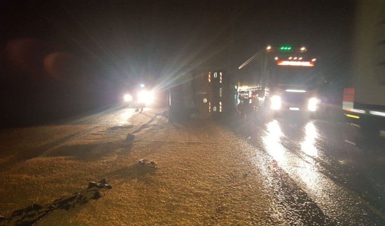 Allí, por causas a establecer, se produjo el vuelco de un camión Scannia 360, con acoplado cargado con maíz en grano, esparciéndose dicha carga sobre media calzada de la carpeta asfáltica.