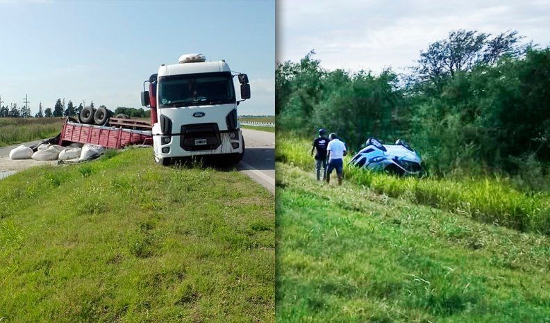 La unidad era conducida por un hombre de 48 años domiciliado en la localidad de Holmberg, quedando dicho acoplado sobre la carpeta asfáltica volcando la carga de bolsones de pastina sobre la banquina.
