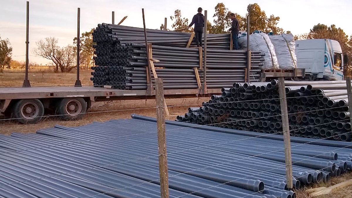 La llegada de los primeros camiones con los caños del acueducto ganadero del sur fue la señal del inminente inicio de una obra que permitirá duplicar la explotación ganadera en una región de 50 mil hectáreas.