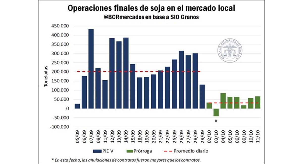 Mientras que el volumen promedio diario de toneladas negociadas en la instancia inicial del dólar soja IV fue de casi 202.000 toneladas, desde el inicio del período de prórroga hasta la actualidad se llevan comercializadas un promedio diario de 31.000 toneladas. “En otras palabras, se observa una caída del 85% en el volumen de soja promedio diario comercializado en octubre”, explicó un informe de la Bolsa de Comercio de Rosario.