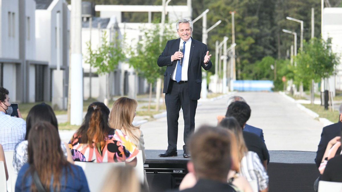 "Las empresas y bancos privados buscan formalizar un negocio, donde ellos tienen que garantizarse una ganancia, que muchas veces es a costa de los que tienen que pagar esos créditos", planteó el mandatario, que compartió el acto con los ministros de Desarrollo Territorial y Hábitat, Jorge Ferraresi, y de Obras Públicas, Gabriel Katopodis, entre otros funcionarios.
