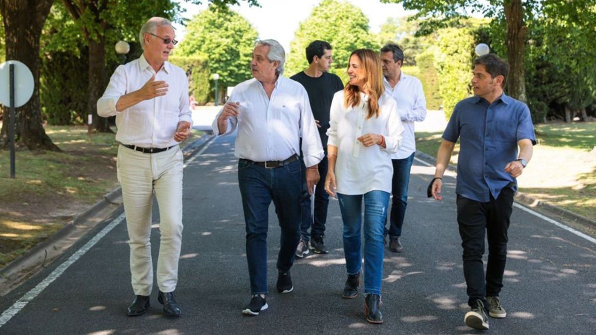 En una serie de fotografías que difundió la Casa Rosada se puede ver al jefe de Estado distendido caminando por las calles interiores de la Quinta de Olivos junto a varios dirigentes del Frente de Todos.