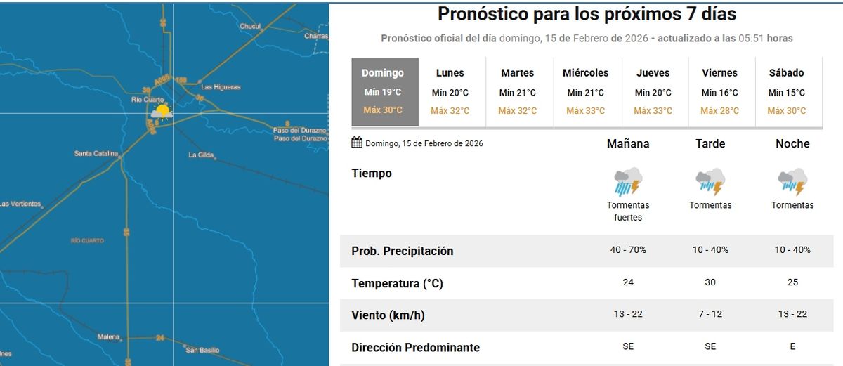 La mayor probabilidad de tormentas severas en Río Cuarto rige para la mañana de este domingo.