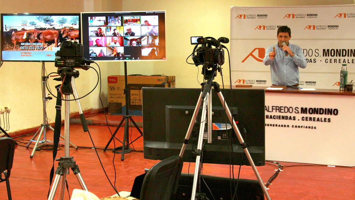 En los días previos, el equipo de la consignataria se encargó de filmar todos los animales en sus campos y luego esas imágenes fueron cargadas con la información correspondiente de los vacunos (peso, raza, procedencia) para ser presentados en la transmisión. En un plasma ubicado delante del martillero había unos 15 representantes de distintos puntos del centro del país que eran los encargados de realizar las ofertas y allí iba subiendo el precio de los animales.