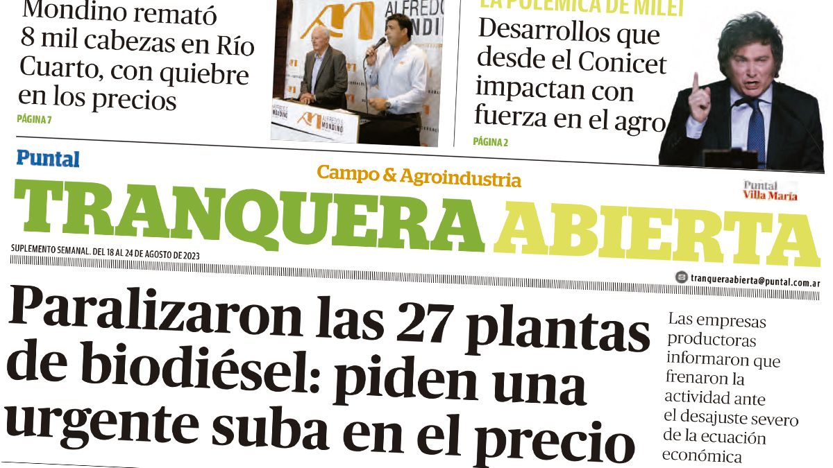 El suplemento Tranquera Abierta presenta hoy el panorama de las industrias del biodiesel, se paralizan 27 plantas y piden una suba urgente en el precio. Las empresas productoras informaron que frenaron la actividad ante el desajuste severo de la ecuación económica.