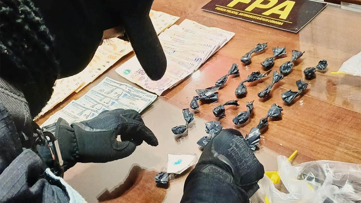 Durante el palpado preventivo y el registro de sus pertenencias, se incautaron 410 dosis de cocaína, 664 de marihuana (distribuidas en frascos de vidrio), dinero, armas blancas y otros elementos de interés para la causa.