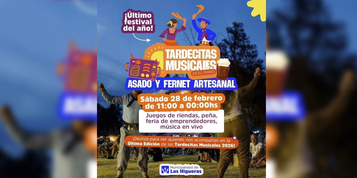 La Municipalidad de Las Higueras confirmó la realización de la última edición 2026 de “Tardecitas Musicales en el Ferro”, que se desarrollará el sábado 28 de febrero, de 11:00 a 00:00 horas, con entrada libre y gratuita.