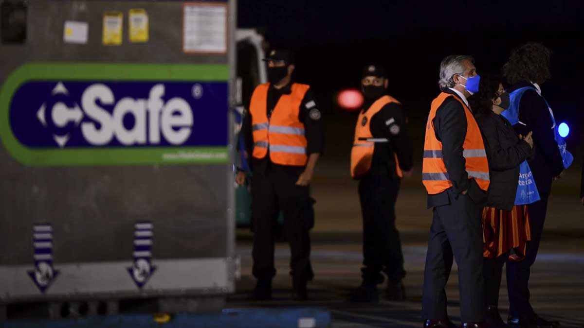 El presidente Alberto Fernández encabezó la comitiva que recibió el nuevo cargamento de vacunas en el aeropuerto de Ezeiza.
