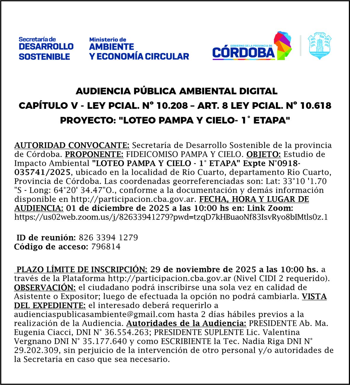 Autoridad convocante: Secretaría de Desarrollo Sostenible de la provincia de Córdoba. Proponente: Fideicomiso Pampa y Cielo. Objeto: Estudio de Impacto Ambiental
