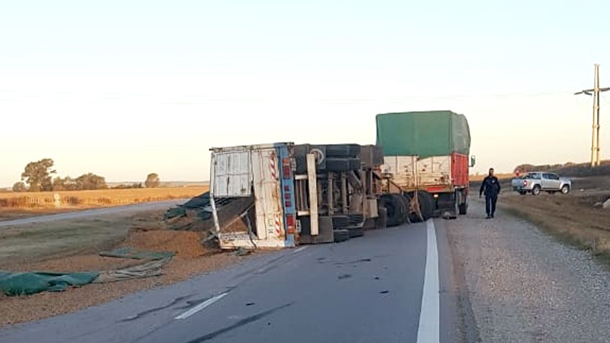 Minutos después, a las 18, en el kilómetro 675, a la altura de Berrotarán, volcó un acoplado cargado con maní que era remolcado por un camión.