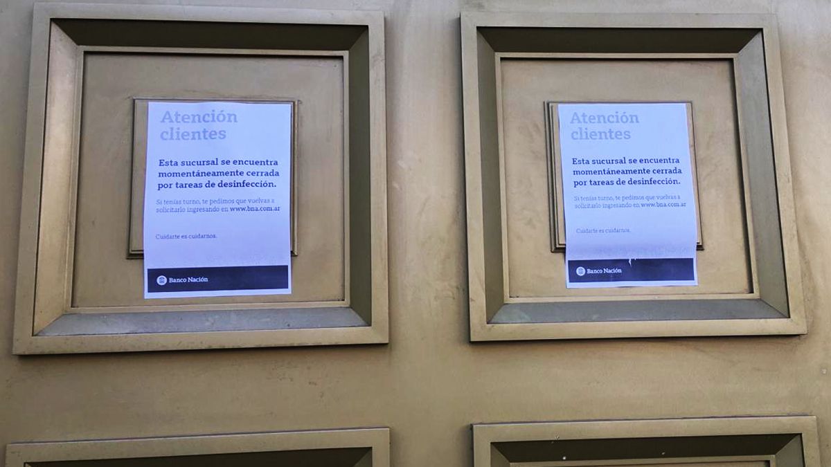 En las puertas de la sucursal se informa a los clientes que: "Esta sucursal se encuentra momentáneamente cerrada por tareas de desinfección" e invitan a concretar los trámites bancarios mediante el sitio web de la entidad nacional.