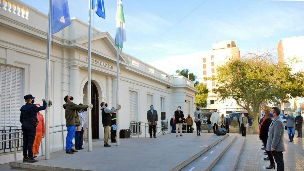 En ese sentido, el izamiento de las banderas estuvo a cargo del enfermero Darío Mansilla, la Dra. Nora Waimas, el Sacerdote Carlos Juncos, la integrante del EPU Irma Flores, la Sargento de Policía Natalia Gonzales, y el Bombero Juan Manuel Andrea, “como un homenaje a los héroes cotidianos de nuestro país, que nos cuidan y contienen en estos días difíciles que nos toca atravesar”.