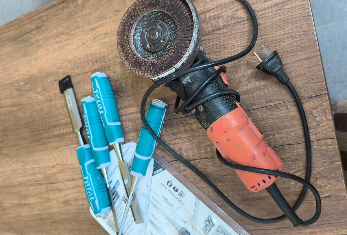 En poder del delincuente secuestraron una amoladora y herramientas de carpintería, como cuatro formones.