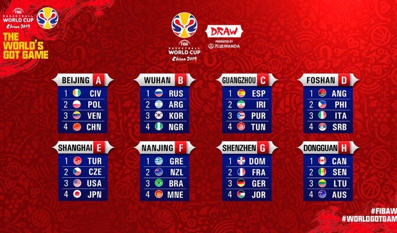 Grupo C: España, Irán, Puerto Rico y Túnez; Grupo D: Angola, Filipinas, Italia y Serbia; Grupo E: Turquía, República Checa, Estados Unidos y Japón; Grupo F: Grecia, Nueva Zelanda, Brasil y Montenegro y Grupo G: República Dominicana, Francia, Alemania y Jordania.