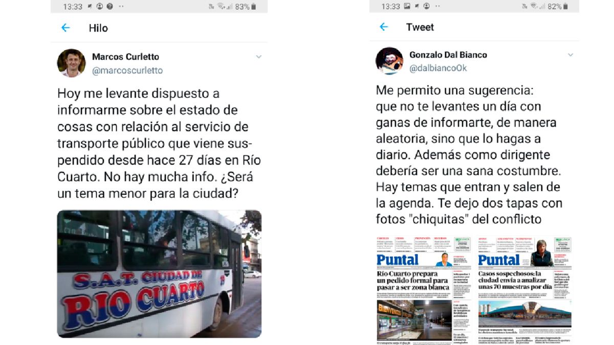 El candidato a concejal por la UCR Marcos Curletto es un activo usuario de la red del pajarito y en la semana quiso ser “sarcástico” con un posteo que hacía referencia a la supuesta falta de información en los medios de la ciudad sobre el paro de transporte urbano (izquierda). La rápida contestación llegó por parte del periodista de Puntal Gonzalo Dal Bianco (derecha), quien le refrescó la memoria a Curletto y lo invitó a que se informe de manera periódica y no aleatoria: “Como dirigente debería ser una sana costumbre”