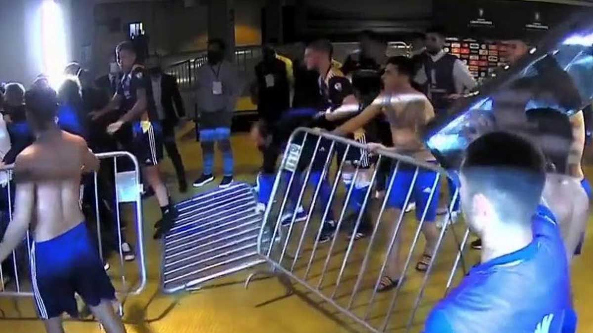 En las imágenes televisivas también se ve como el presidente del Mineiro, Sergio Coelho lanza una botella de agua a los jugadores de Boca que estaban del otro lado del vestuario en el medio de un caos general.