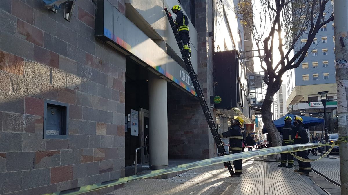 En medio de una jornada con intenso viento, comenzó a caer parte del revoque del frente de una entidad bancaria del microcentro de la ciudad y Bomberos tomaron intervención para evitar mayores consecuencias.