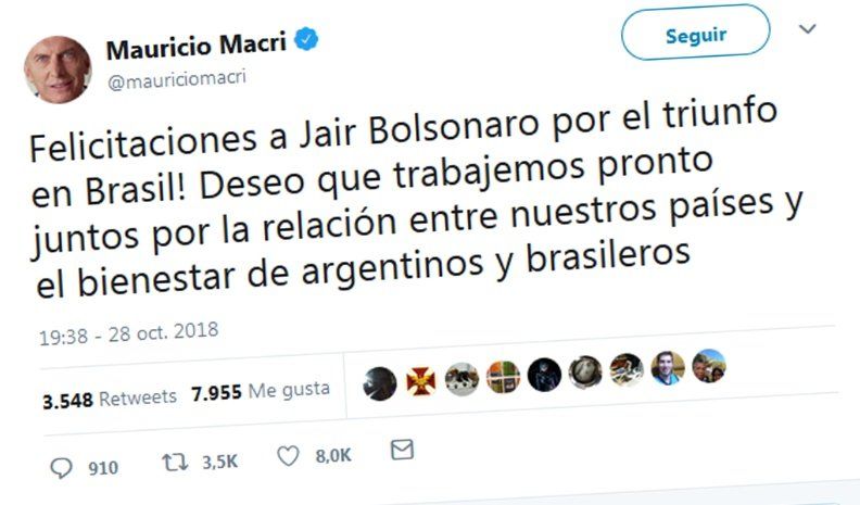 "¡Felicitaciones a Jair Bolsonaro por el triunfo en Brasil! Deseo que trabajemos pronto juntos por la relación entre nuestros países y el bienestar de argentinos y brasileros", expresó el líder del PRO.