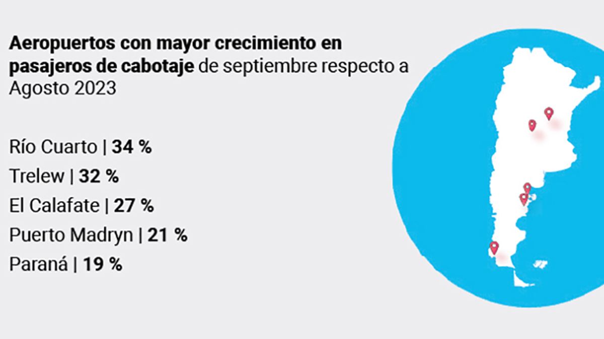 La Agencia Nacional de Aviación Civil (Anac) dio a conocer el informe mensual correspondiente que reúne las estadísticas del mes de septiembre. El mismo indica que el Aeropuerto de Río Cuarto se ubica en el primer lugar entre los aeropuertos con mayor crecimiento en pasajeros de cabotaje respecto de agosto de 2023.