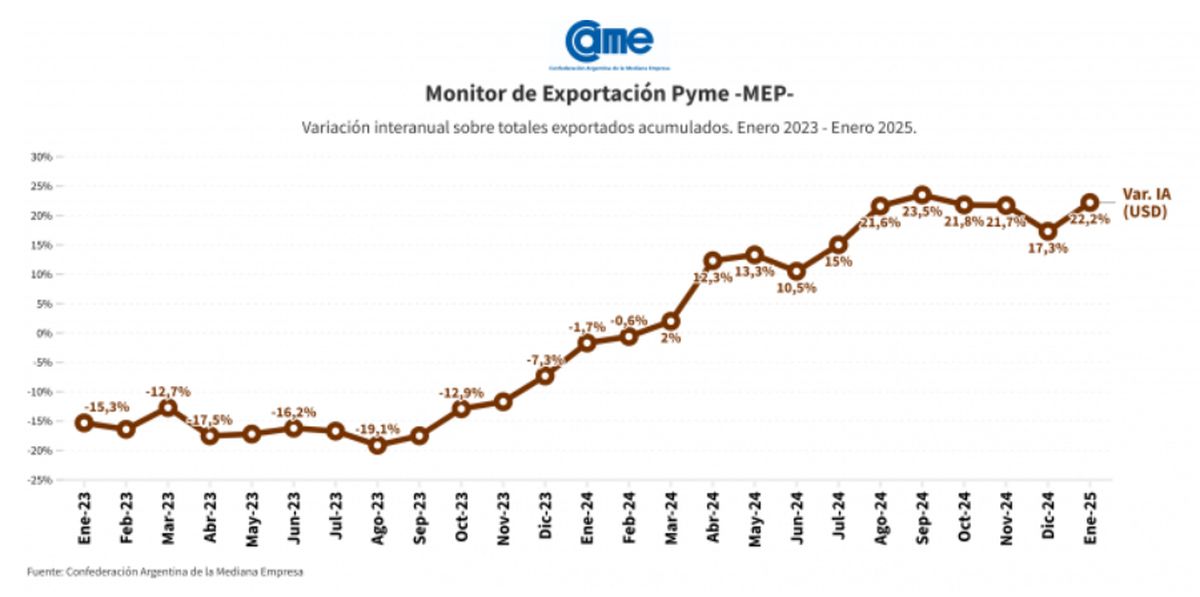 Son datos del Monitor de Exportación Pyme (MEP), un indicador elaborado por el sector de Estadísticas e Informes de la Confederación Argentina de la Mediana Empresa (CAME), para medir las exportaciones de las pequeñas y medianas empresas de la República Argentina, en base al monitoreo mensual de las operaciones de las empresas argentinas en el comercio exterior, discriminando por su condición pyme declarada ante la Secretaría de la Pequeña y Mediana Empresa, Emprendedores y Economía del Conocimiento, dependiente del Ministerio de Economía de la Nación.