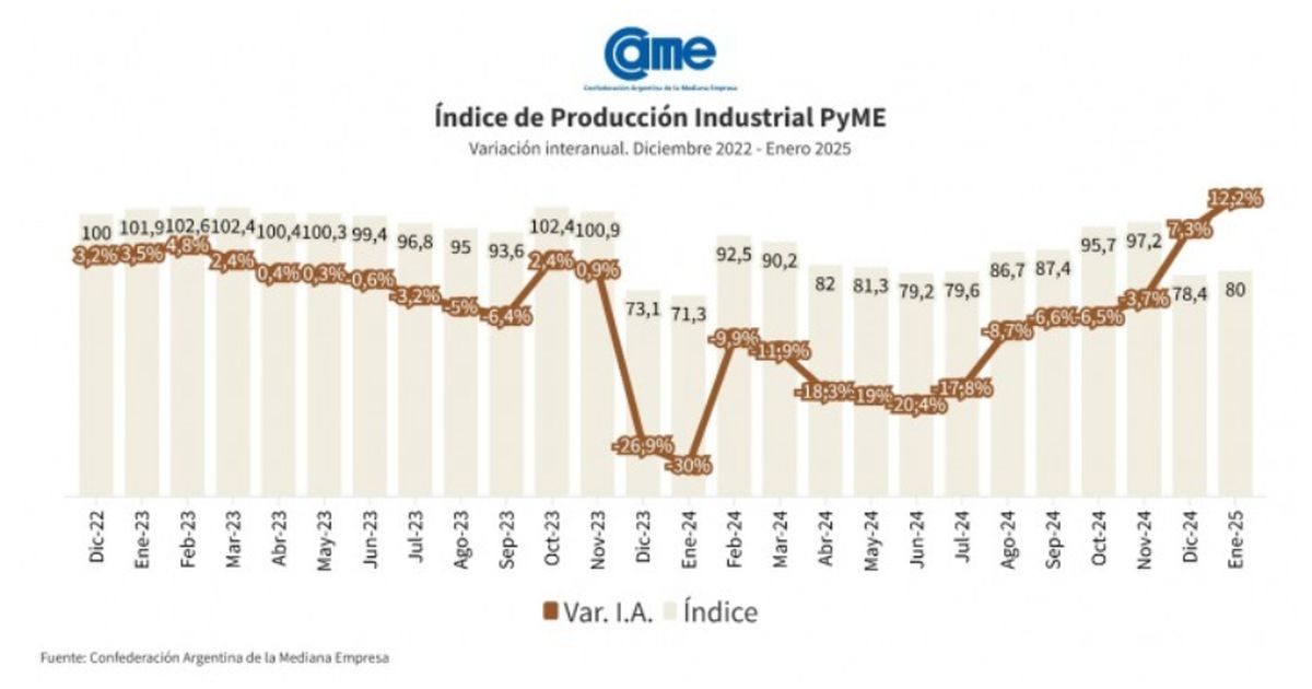 La producción manufacturera de las pymes registró un ascenso del 12,2% interanual en enero. No obstante, a pesar de esta mejora las industrias aún no lograron recuperar los niveles previos a la profunda caída del mismo mes de 2024, cuando la producción marcó un mínimo histórico del -30%. A su vez, en enero la comparación mensual desestacionalizada también mostró un avance del 4,8%, reflejando el repunte de la actividad industrial.