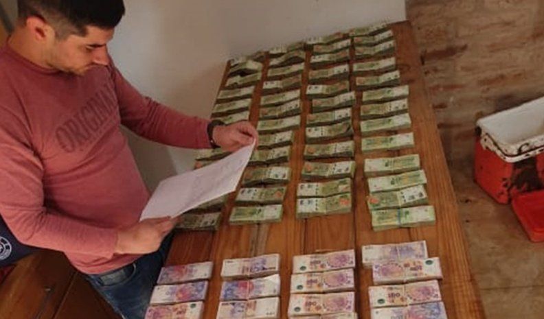 De esta manera, este jueves se desarrollaron tres allanamientos en La Playosa. En uno de ellos, realizado en el domicilio de Lione, en el patio encontraron una conservadora enterrada con $ 2.940.500 en su interior. El dinero estaba discriminado en billetes de 100 y 500 pesos. Como resultado de este procedimiento, el implicado en el episodio fue detenido e imputado como supuesto autor del delito de hurto.