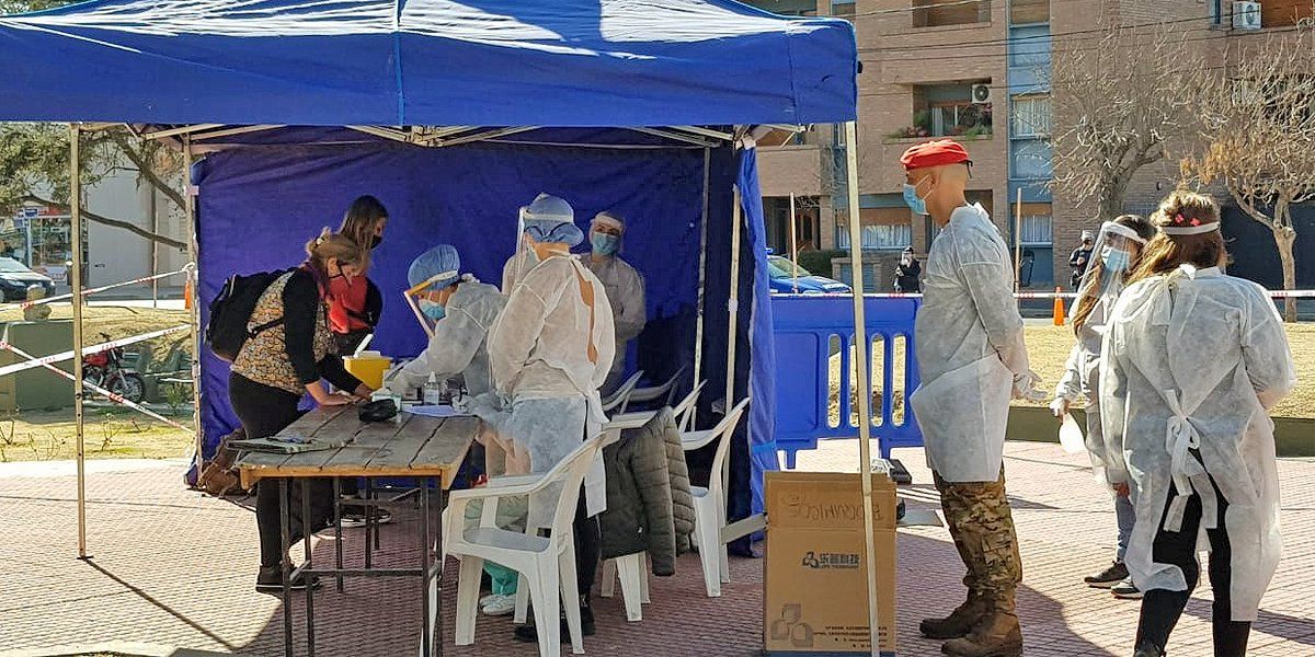 En la plaza se instalaron dos gacebos a modo de puestos sanitarios y estacionado en la vía pública una unidad sanitaria de la Provincia. En el primer gacebo se realizan test rápido y ante la detección de un posible caso, la persona se dirige al segundo puesto para ser sometida a un hisopado.