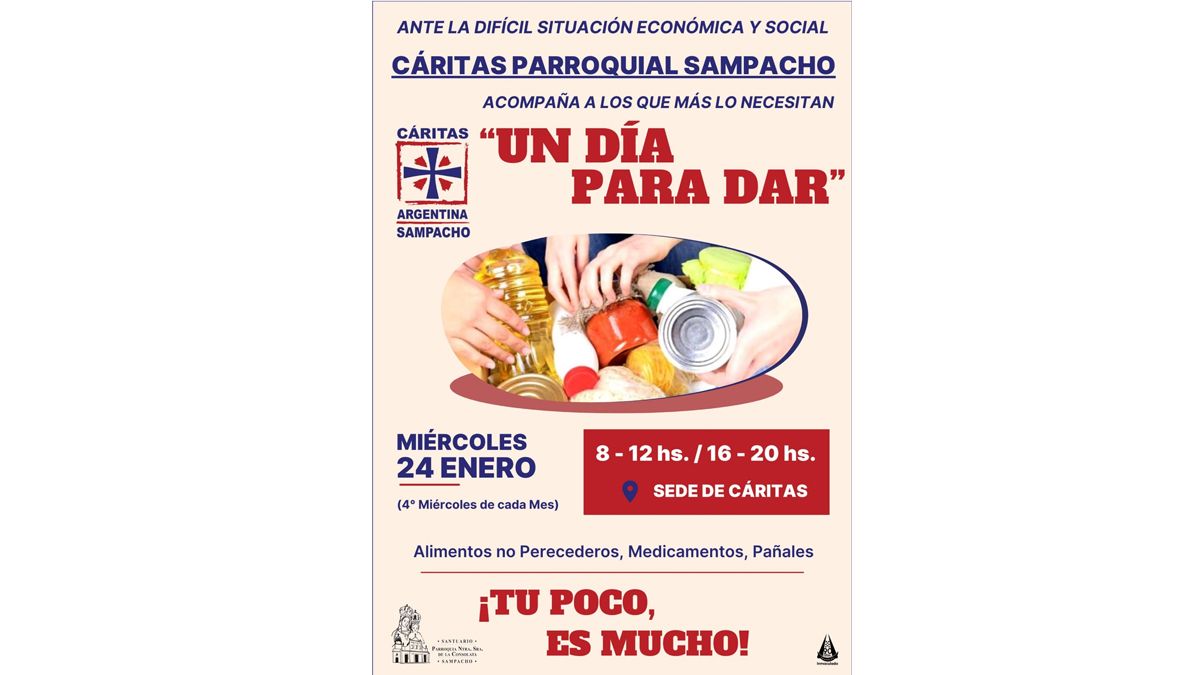 Cáritas Parroquial Sampacho organizará todos los cuartos miércoles de cada mes la campaña solidaria: "Un día para dar".