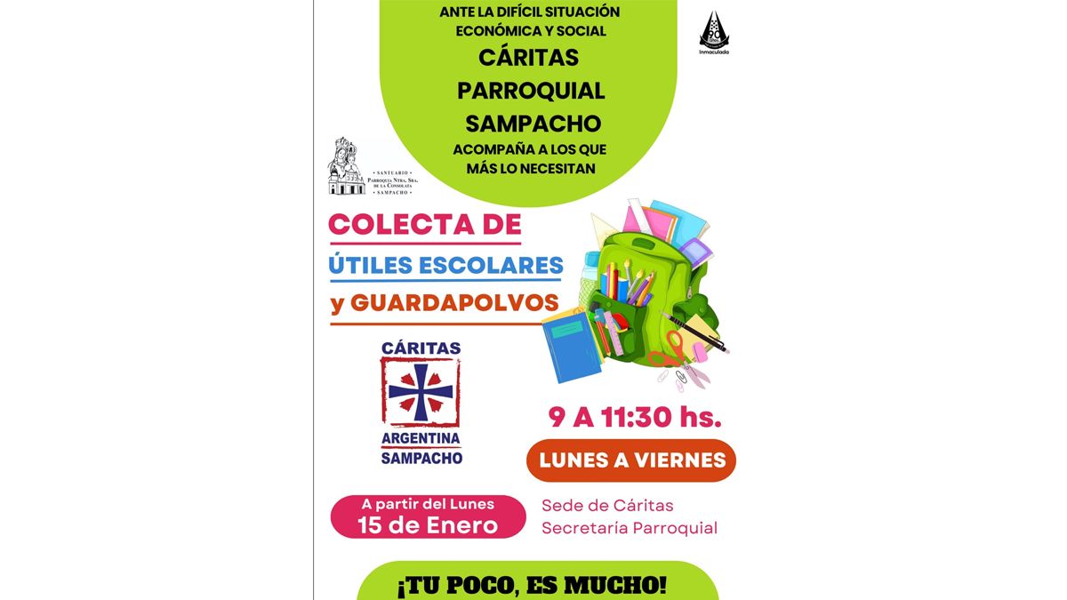 Desde Cáritas Sampacho además se comenzó una iniciativa solidaria de recolección de útiles escolares y guardapolvos. Esta colecta se lleva a cabo desde el 15 de enero en la Sede de Cáritas, de lunes a viernes desde las 9 a las 11:30 horas.