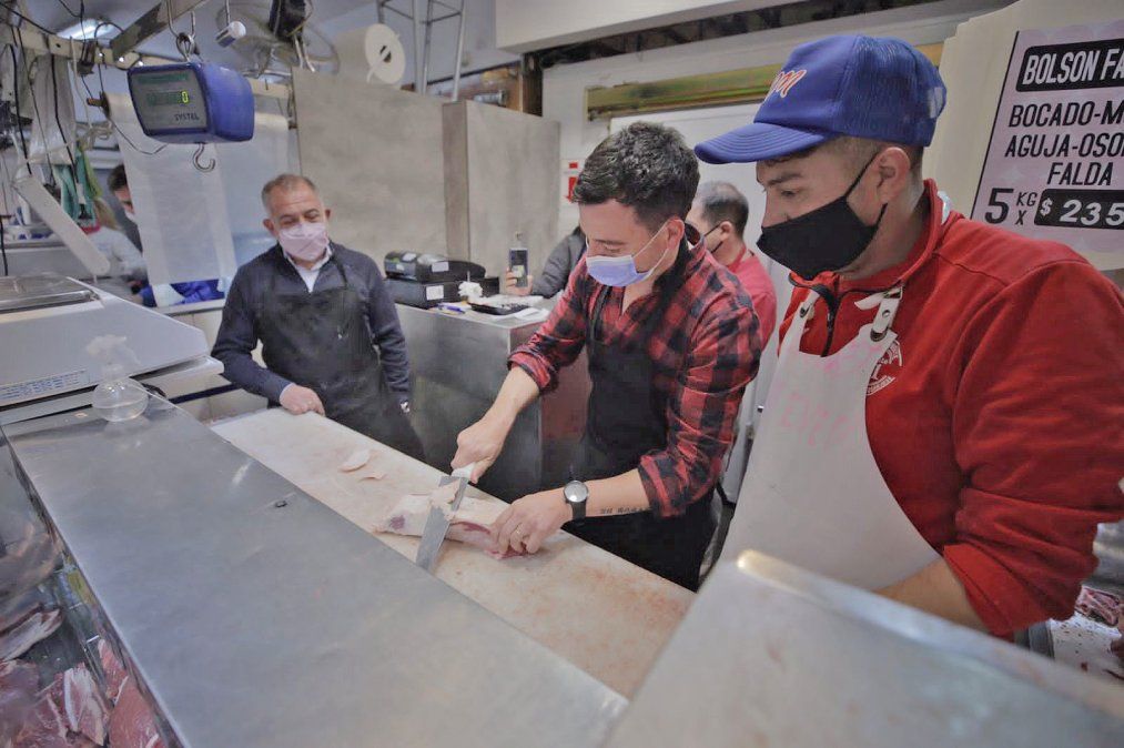 En apoyo al sector de la carne, los candidatos se pusieron detrás del mostrador de una carnicería del Mercado y afirmaron: “El cepo a las exportaciones de carne es un retroceso en el desarrollo y expansión de nuestro país”.