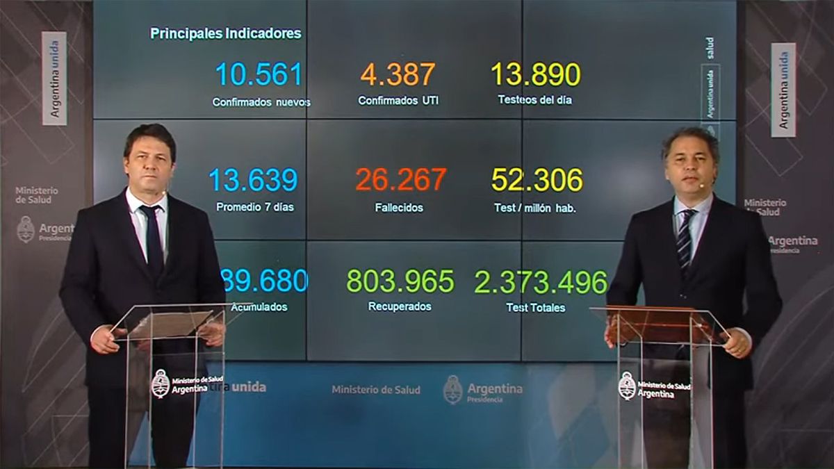 En el reporte oficial se indicó, además, que fueron 10.561 los positivos de Covid-19 que se reportaron ayer en la Argentina, con una tasa de incidencia de 2.181 cada 100.000 habitantes, 989.680 el total de infectados hasta el momento y 4.387 las personas que se encuentran internadas en unidades de terapia intensiva.