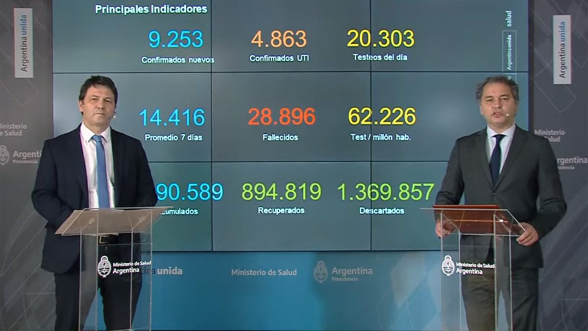 En el reporte oficial se indicó, además, que ayer en Argentina se constataron 9.253 casos positivos de Covid-19, con una tasa de incidencia de 2.403 cada 100.000 habitantes.