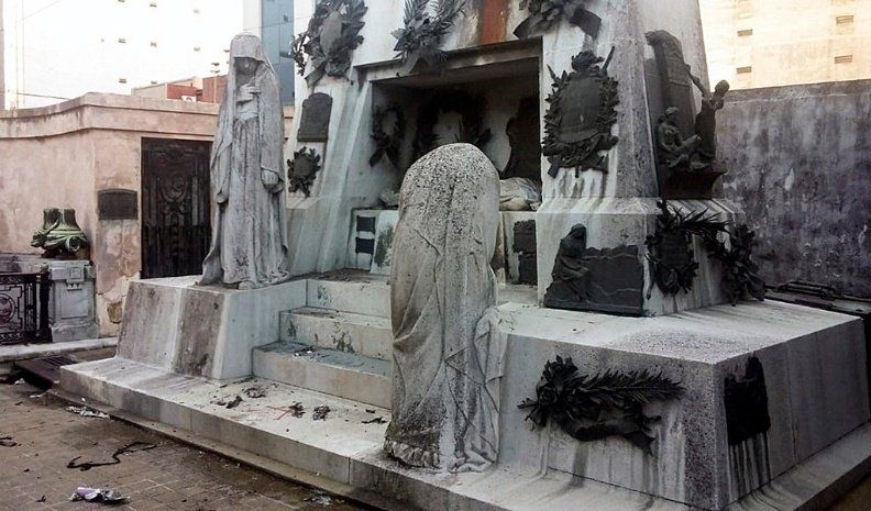 Al recorrer el predio, personal policial advirtió que frente al mausoleo de Falcón, de quien hoy se cumplen 109 años del atentado que provocó su muerte, había pintadas anarquistas y un caño con apariencia de artefacto explosivo y restos metálicos producto de la deflagración, por lo que se convocó al Escuadrón Antibombas.