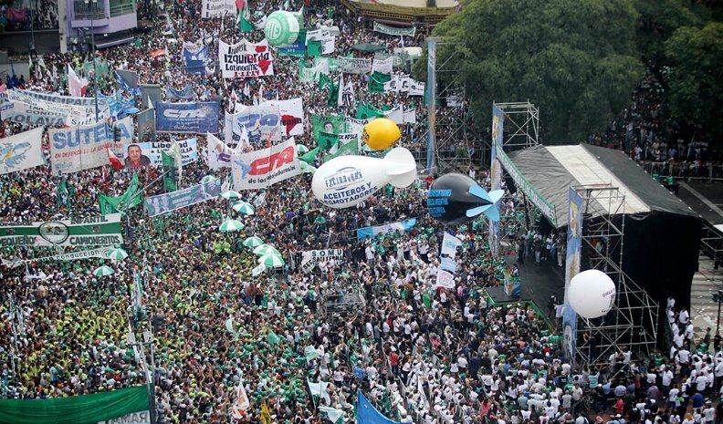 Sobre el palco estuvieron Hugo Moyano, Hugo Yasky (CTA de los Trabajadores), Pablo Micheli (CTA Autónoma), Esteban "Gringo Castro (CTRP), Sergio Palazzo (Corriente Federal de Trabajadores) y el miembro del triunvirato Juan Carlos Schmid (CGT), todos ellos oradores del acto, aunque este último sólo se limitó a leer un pasaje del documento elaborado durante la cumbre sindical de Mar del Plata de enero, en la que se hizo la convocatoria a la marcha.