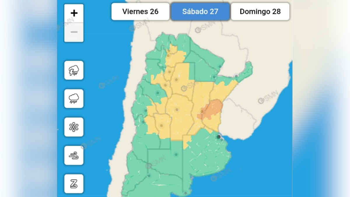 Mientras que el día de hoy las máximas alcanzarían los 33º y el cielo estará algo nublado, para mañana el SMN emitió un alerta que rige desde sábado a las 00.00 ART hasta las 5:59 ART del mismo día.