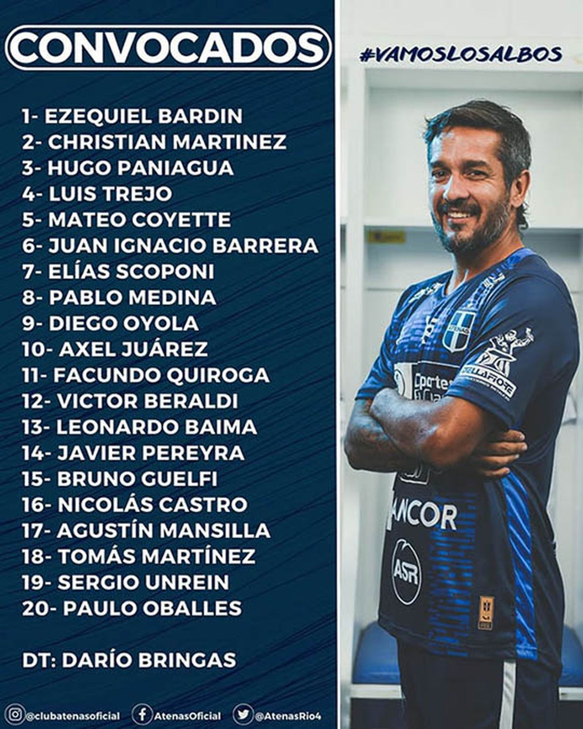 Atenas: Ezequiel Bardín; Mateo Coyette, Hugo Paniagua, Pablo Medina y Elías Scoponi; Javier Pereyra o Víctor Beraldi y Axel Juárez; Agustín Mansilla, Leonardo Baima y Diego Oyola;Sergio Unrein. DT: Darío Bringas.