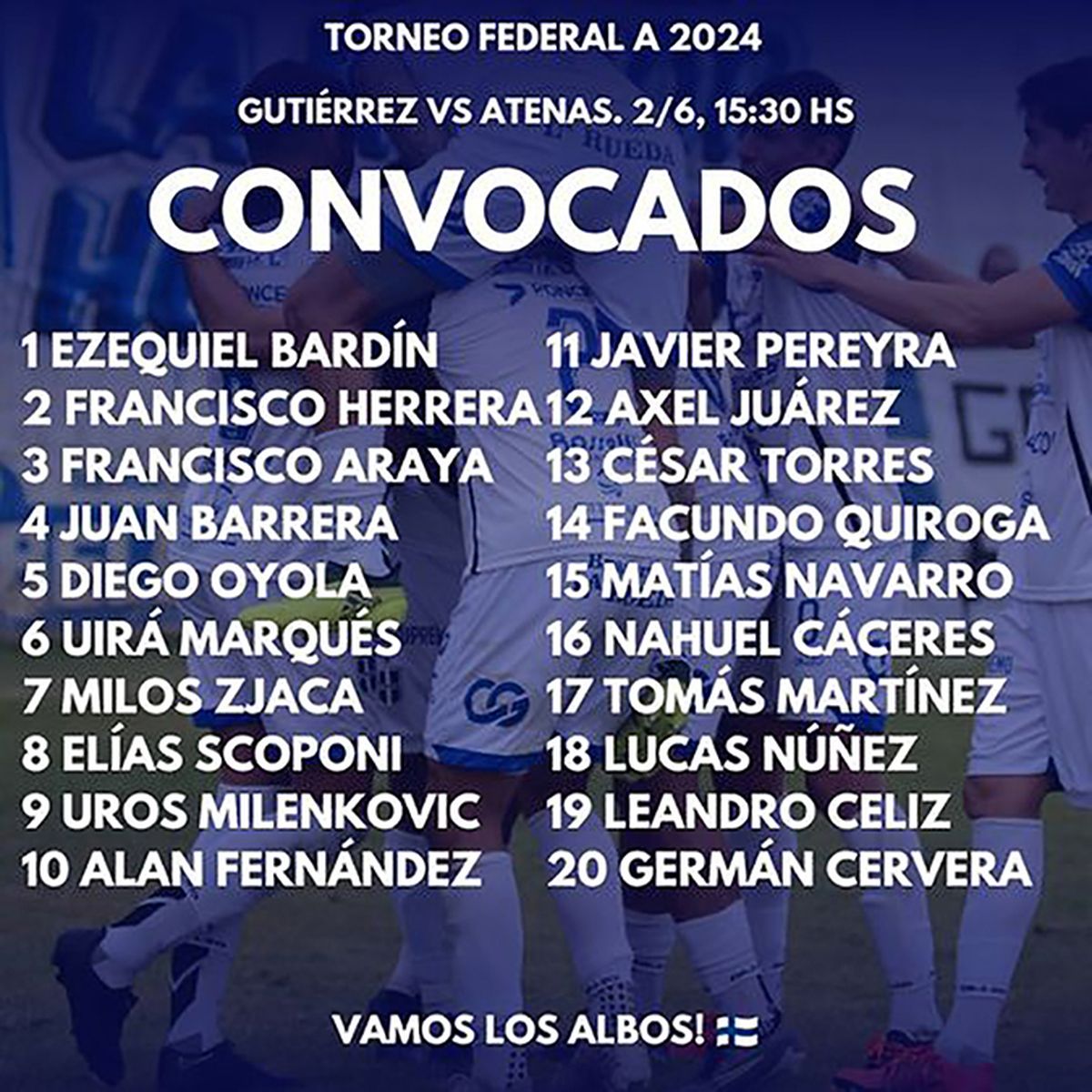 La delegación Alba partió ayer después del mediodía rumbo a Mendoza, y entre los 20 jugadores nominados, el once inicial del último partido está entre los convocados: Ezequiel Bardín, Francisco Araya, Elías Scoponi, Juan Barrera, Axel Juárez, Uira Marques, Tomás Martínez, Facundo Quiroga, Germán Cervera, Lucas Núñez y Diego Oyola, forman parte de la delegación de los 20 jugadores. Ahora, resta definir si el técnico Darío Bringas le dará la confianza al mismo 11 que superó a Estudiantes de San Luis por 4 a 2.