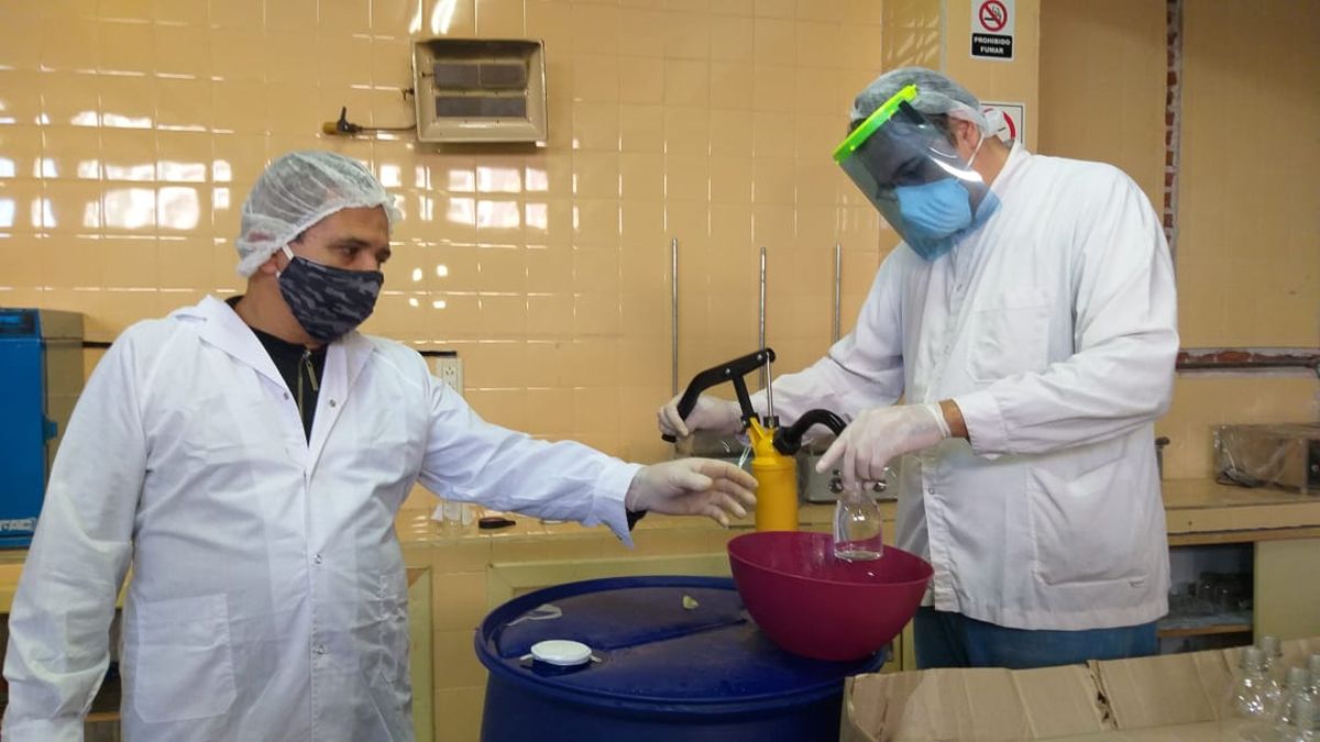 Recibieron dos tambores de 200 litros de alcohol y pusieron manos a las obra. Del trabajo de fraccionamiento y envasado participan profesores del Ipet 259 'Ambrosio Olmos', que funciona en el histórico edificio del Colegio Industrial.