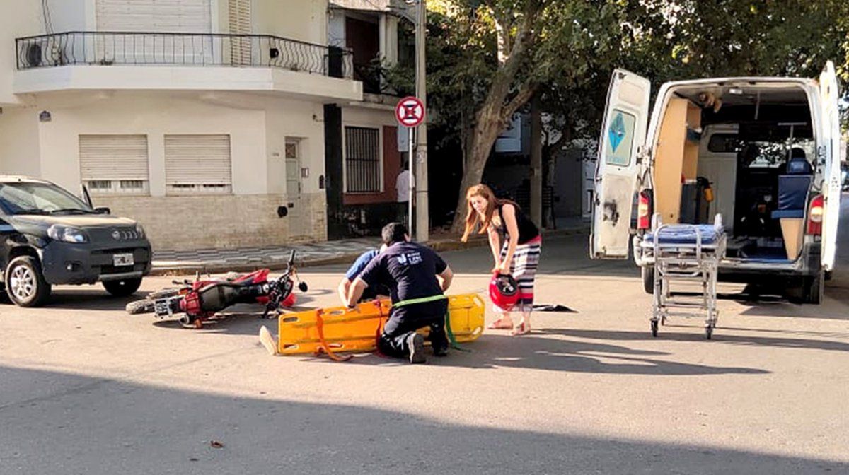 La conductora de una motocicleta Honda tipo enduro fue asistida por el servicio de emergencias tras colisionar con un automóvil Fiat Uno en la esquina de HipólitoYrigoyen y Pringles. El accidente fue a las 18. La motociclista, que circulaba por la primera de las calles mencionadas, tenía el casco colocado.