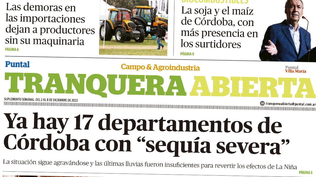 El suplemento Tranquera Abierta presenta entre sus principales títulos la "sequía severa" que ya existe en 17 departamentos de la provincia de Córdoba.