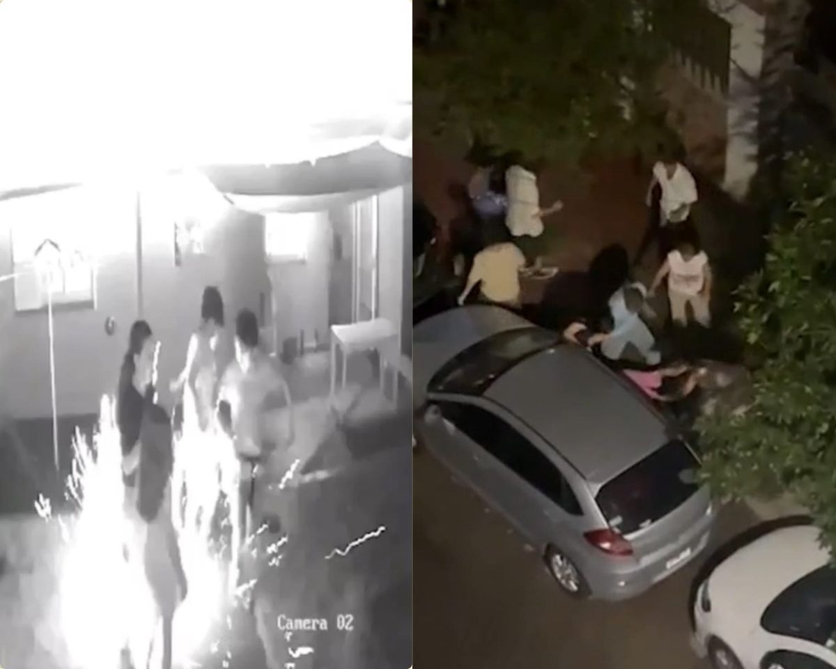 Las cámaras de seguridad también registraron la escalada del conflicto en la vía pública. En una de las grabaciones, tomada desde un domicilio de la cuadra y orientada hacia la vereda, se observa a una mujer increpar a un hombre señalado como quien habría arrojado la pirotecnia. La discusión es tensa, la mujer le lanza manotazos y el hombre responde con violencia.