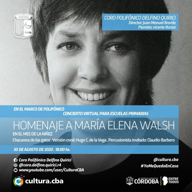 En el marco de Polifónico, el ciclo de conciertos virtuales para escuelas primarias, y en el Mes de la Niñez, el Coro Polifónico Delfino Quírici, dirigido por Juan Manuel Brarda, realizará un homenaje a María Elena Walsh con la interpretación, el domingo a las 18hs., de una versión grabada en remoto de la Chacarera de los gatos, versión coral de Hugo C. de la Vega, con la participación del percusionista invitado Claudio Barbero.
