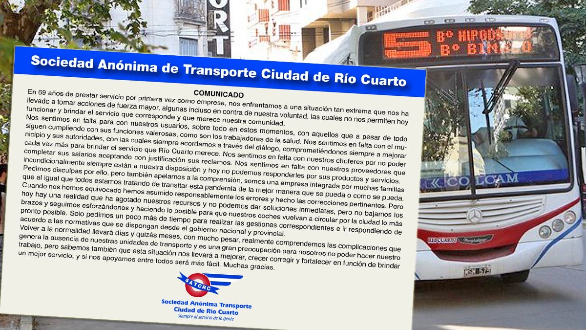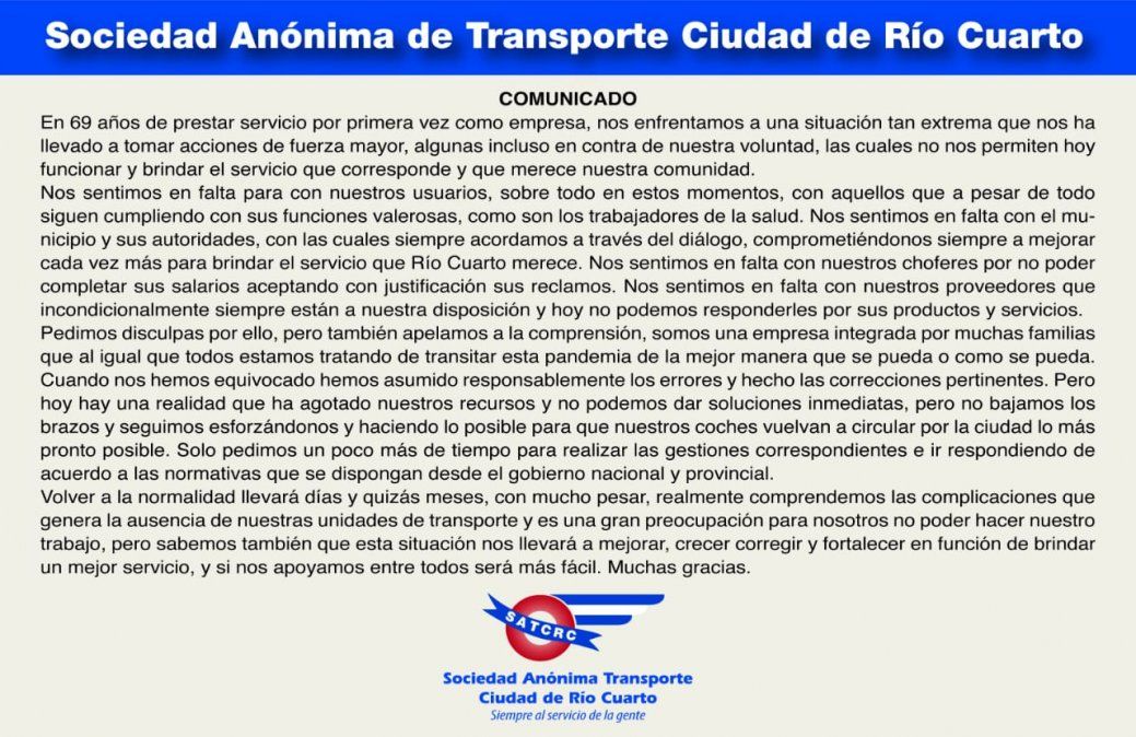A través de un comunicado que lleva la firma de la Sociedad Anónima de Transporte Ciudad de Río Cuarto (SAT Río Cuarto), la empresa de transporte reflejó el estado de situación general que atraviesa a partir de las medidas asumidas por el avance de la pandemia del coronavirus Covid-19.