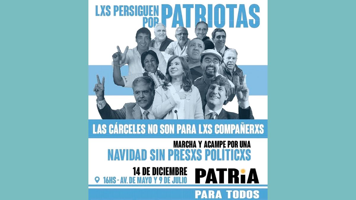 Lunes 7.- Reflotan la campaña “por una Navidad sin presos políticos”.- No nos sorprende, conociendo como conocemos la vena solidaria del universo nac & pop, pero igual siempre es reconfortante una ratificación de que a lxs perseguidxs el pueblo no lxs ha olvidado. ¿No perciben detrás de los rostros sonrientes del afiche una mirada que nos interpela? ¿Que nos pregunta si estamos haciendo lo suficiente para defender los derechos pisoteados de nuestros patriotas caídos en desgracia? No basta con acercarles una sidra y un pan dulce a las oscuras mazmorras de la dictadura macrista residual donde están encerradxs, esas claustrofóbicas celdas de 500 metros cuadrados en medio de asfixiantes parquizaciones dentro de las cuales los confinan, esos modernos instrumentos de tortura que son las tobilleras electrónicas. Hay que marchar bajo el calcinante sol de una siesta de diciembre para recordarle a esa justicia corrupta y acomodaticia que pare de dejarse presionar y a Alberto que haga más fuerza para que los jueces entiendan que lo de las presiones ya no va, y que más les vale dejar de ser instrumentos del lawfare, marionetas al servicio de los poderosos. Y hay que insistir en que no los persiguen por los modestos patrimonios que reunieron en los breves ratos libres que les dejaban sus esfuerzos al servicio del pueblo, por encabezar escraches a garcas o tomas a comisarías, por el descuido de un maquinista que se olvidó de apretar los frenos o por cerrar la investigación interminable de un atentado con la colaboración de los injustamente acusados de ser sus autores. No señor, los persiguen por su amor a la Patria.