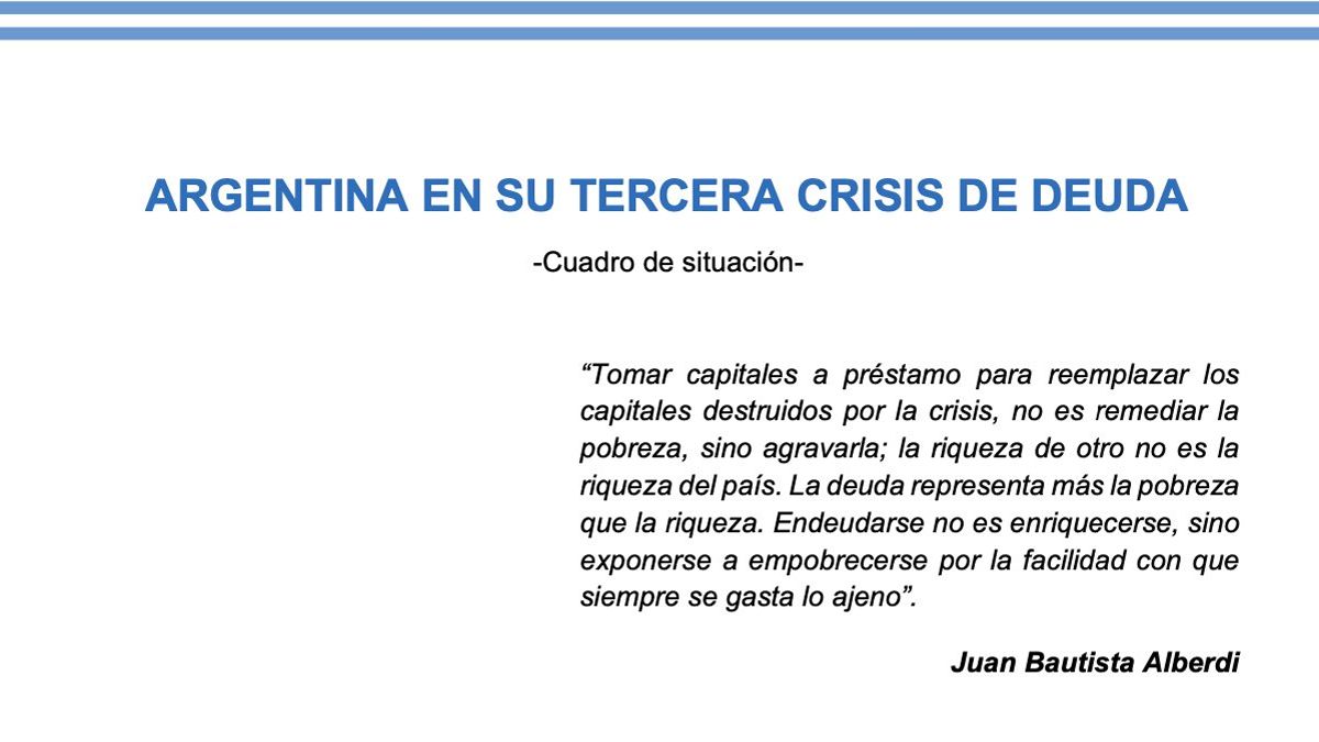 El texto, de 33 páginas, se titula "Argentina en su tercera crisis de deuda. Cuadro de situación" y sostiene que Argentina "está atravesando la tercera crisis de deuda incubada en el gobierno de Mauricio Macri por el brutal endeudamiento contraído con fondos de inversión, agravado por el retorno del FMI a nuestro país con un préstamo de volumen y condiciones inédito y escandaloso".