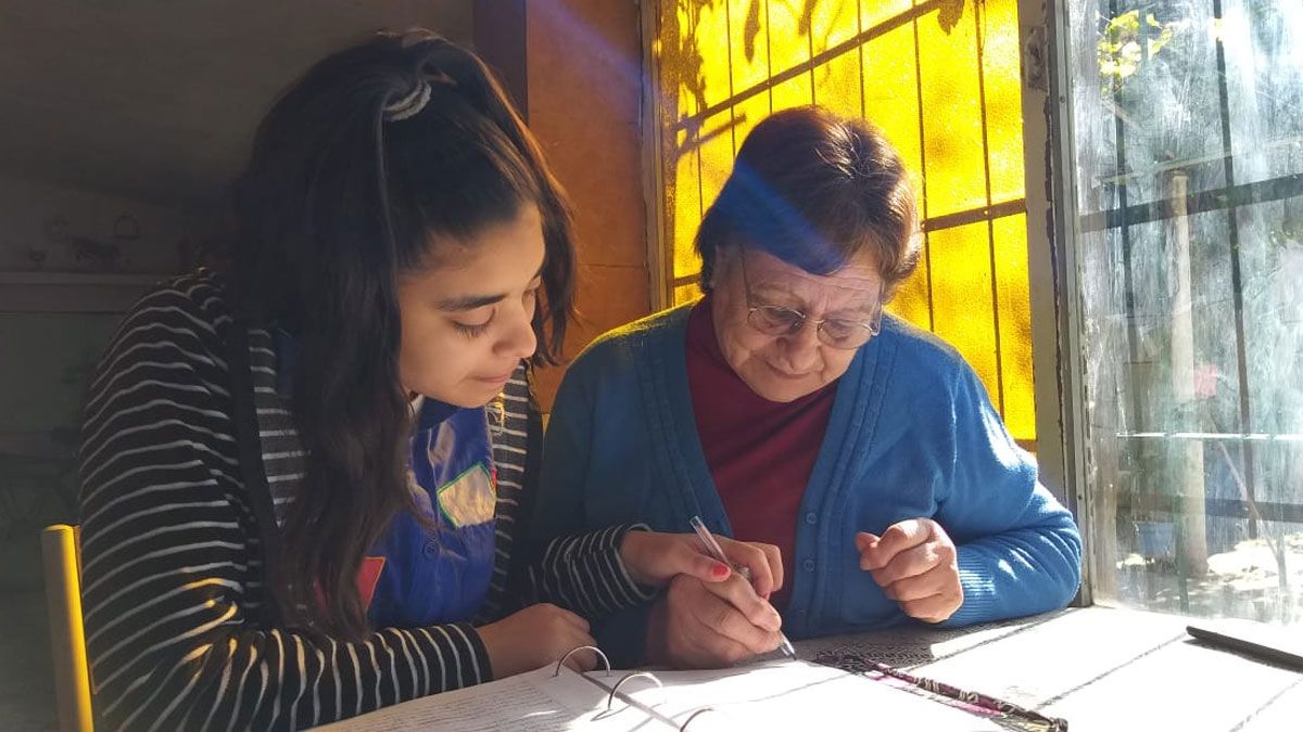 La joven se levanta a las 10 de la mañana y luego de desayunar comienza su día de estudio y de aprendizaje codo a codo con su bisabuela, quien también se adapta a este nuevo tipo de educación. La adolescente recibe los deberes vía WhatsApp.